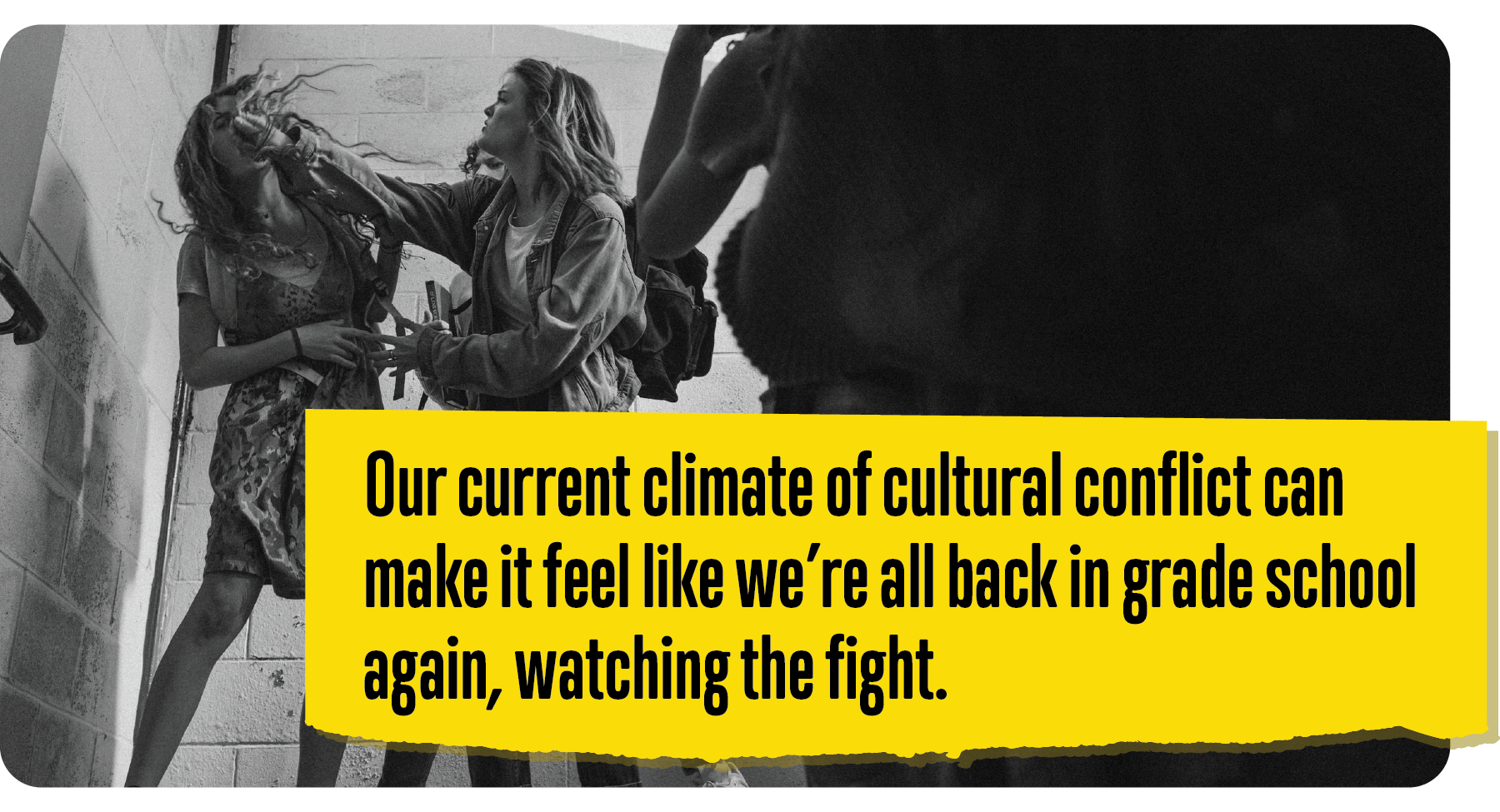Everybody would come running and form a circle of excited spectators. We didn’t care about the cause of the conflict or worry about the people involved. We just wanted to see the drama unfold. And it was almost like drawing the crowd made the escalation of the conflict even more inevitable. It occurred to us that our current climate of cultural conflict can make it feel like we’re all back in grade school again, watching the fight.