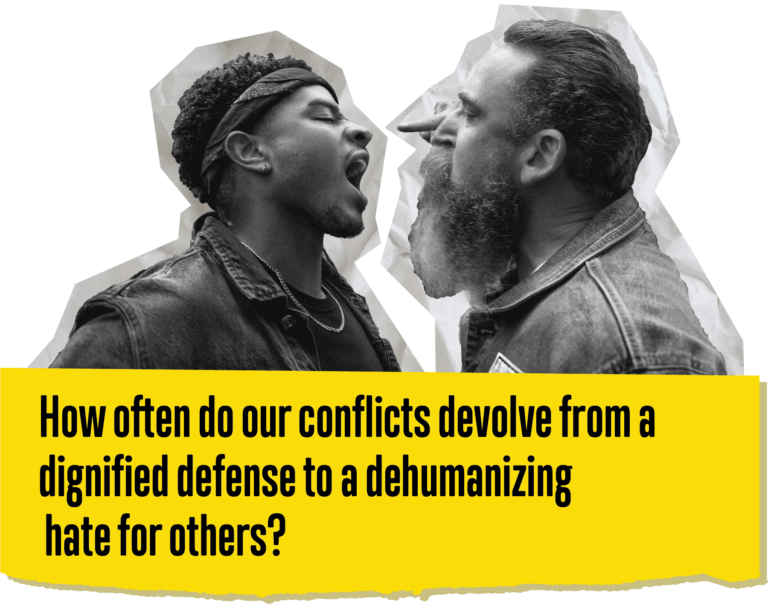 Don’t get us wrong. Conflict can be healthy. Expressing outrage at injustices, being a voice for the voiceless, and boldly representing your values and identity are important parts of the human experience. Jesus did all these things. But how often do our conflicts devolve from a dignified defense to a dehumanizing hate for others? And how often do we just consume conflict that really has nothing to do with values and everything to do with our guilty pleasure of hateful content, just like a grade school fight?